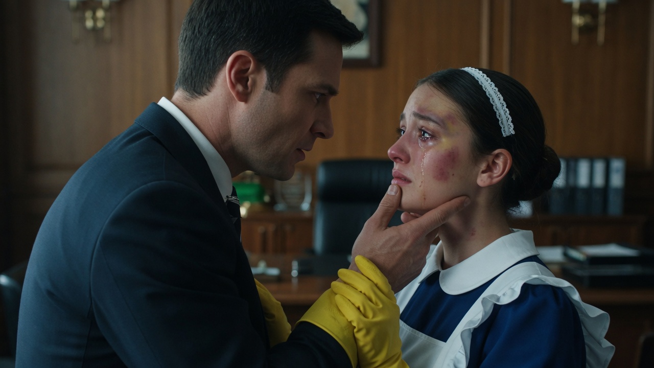 Her shoulders were slightly hunched, as if she had spent years apologizing for taking up space. She moved quickly, eyes lowered, cloth in hand, hoping to clean the mess and disappear—just as she always did.