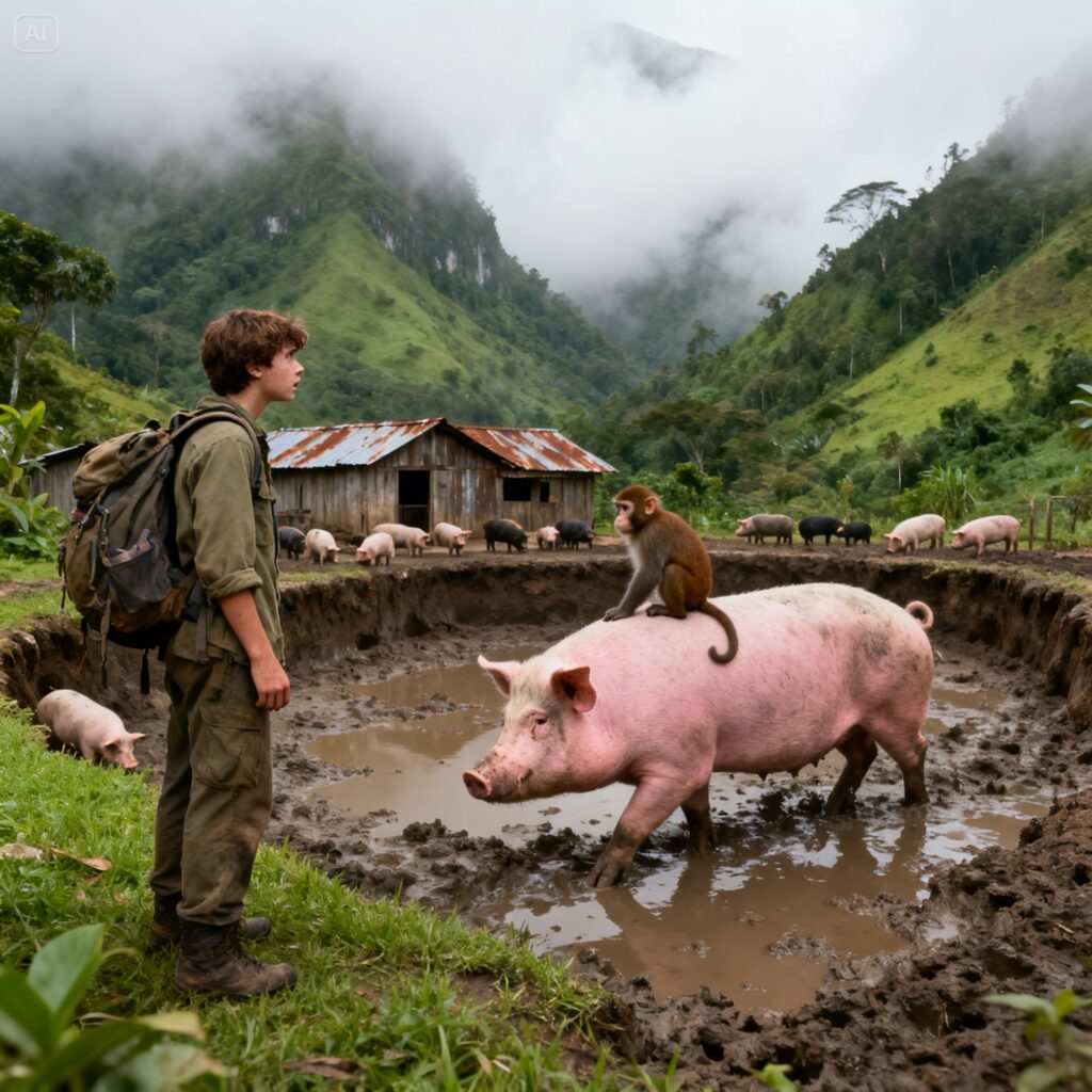 The monkey shrieked once from the branch above, and the sow lifted her head as if the sound meant feeding time. Three younger pigs followed it instantly.