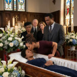 He wore a tailored suit, hair perfectly styled. On his arm was a young woman in a striking red dress, smiling far too confidently for someone standing in front of a coffin.