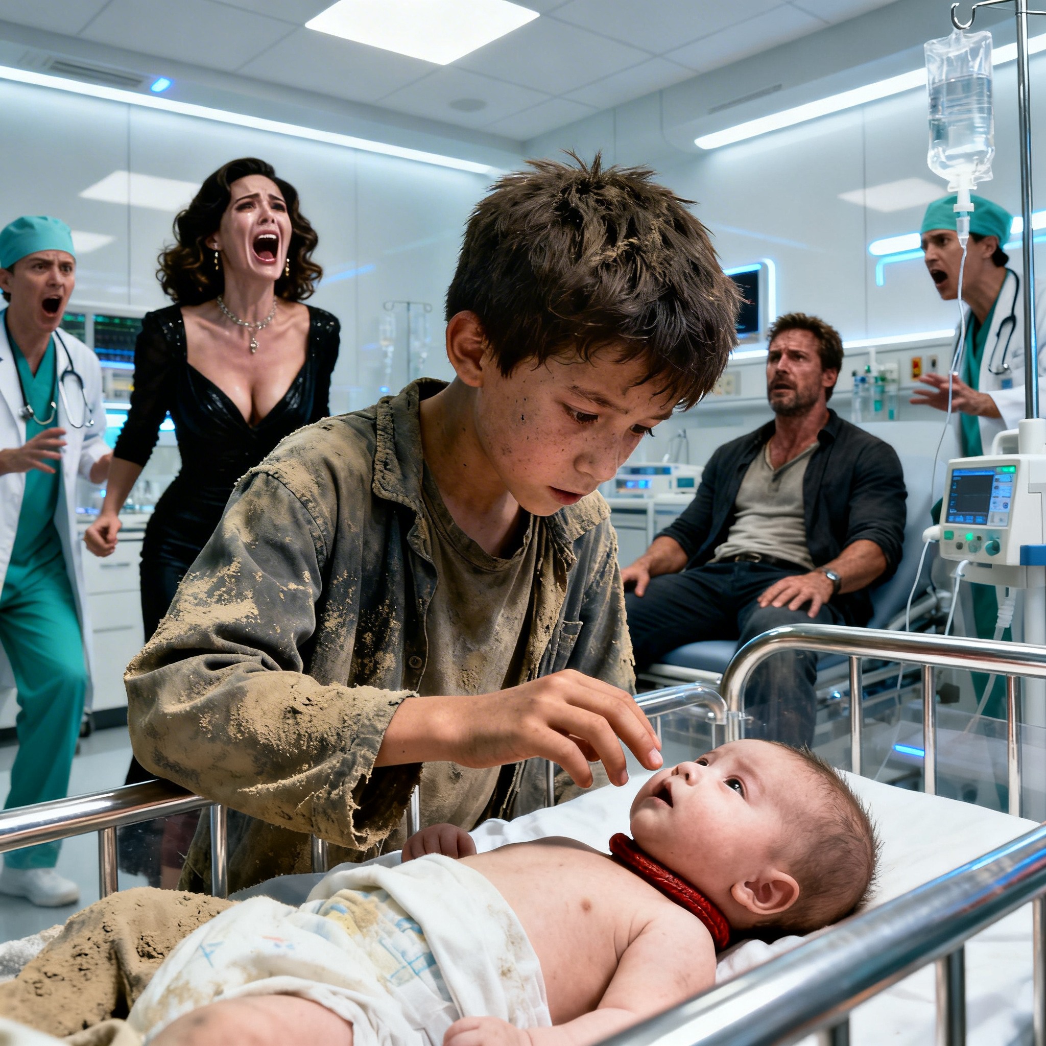In the upstairs hallway, everything was chaos: conflicting orders, hurried footsteps, doors opening and closing. A guard tried to stop him, but the boy slipped behind a stretcher. That’s how he appeared at the door of the room where eight specialists had just surrendered.