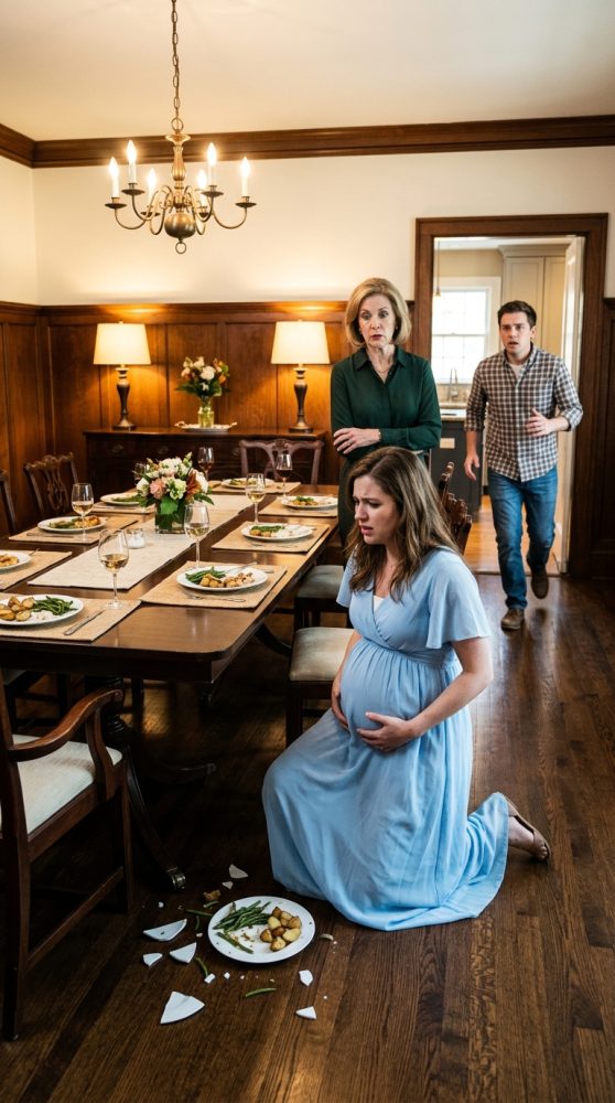 My vision flashed white. I stumbled backward, dizzy, and my stomach slammed hard into the sharp corner of the dining table. A scream tore out of me before I even realized it was mine. Plates shattered. My knees buckled. Warm pain spread through my abdomen, and when I looked down, I saw blood staining the pale fabric of my dress.