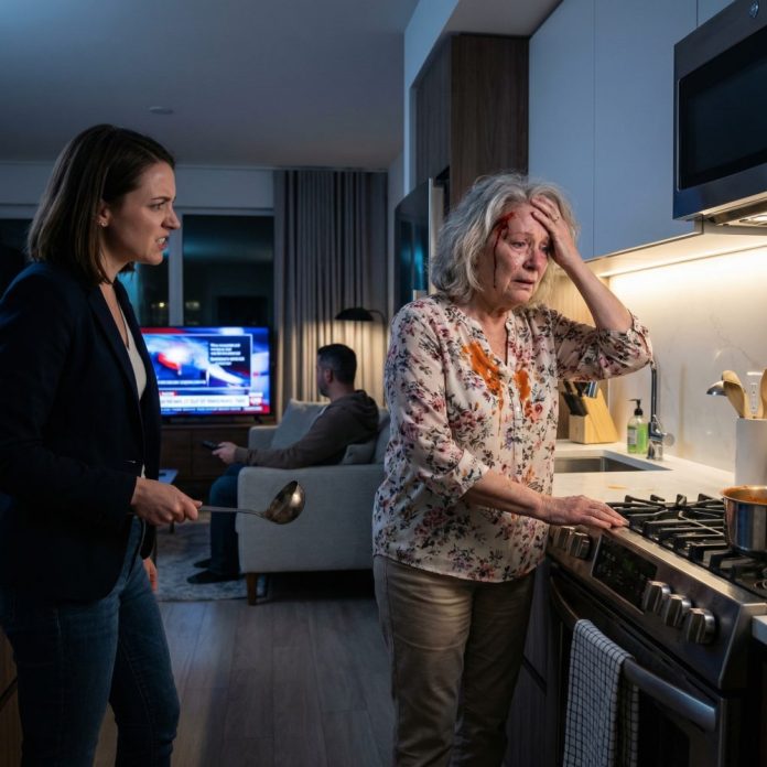 It was warm, metallic, and wrong, sliding down the side of my face as chicken broth dripped from my hair onto Dawn’s spotless kitchen tile. One second, I had been standing over the stove, stirring a pot the way I had for fifty years. The next, my daughter-in-law had slammed an iron serving spoon against my temple so hard my knees buckled.