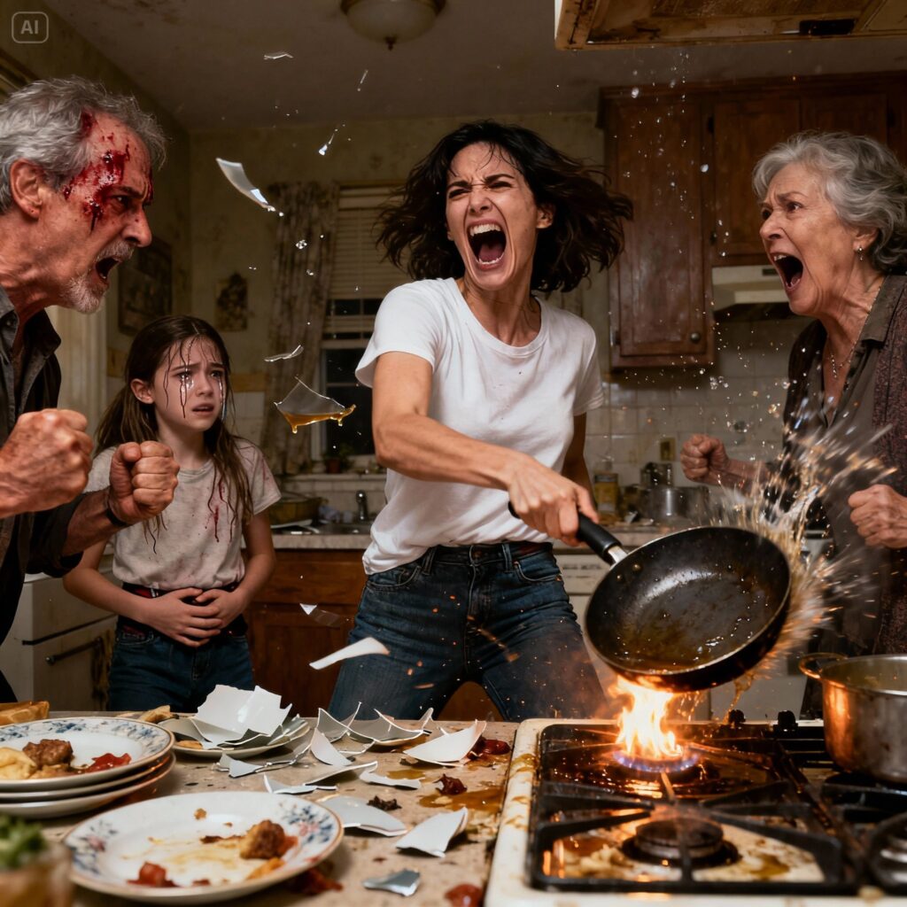 The kitchen was to my left. The cast-iron skillet was still on the stove. In one swift motion, I grabbed it; its weight was solid and real in my hand. I swung a weapon. The impact echoed through the room; Dad’s shout cut through the air. I struck again, protecting the only thing that mattered.