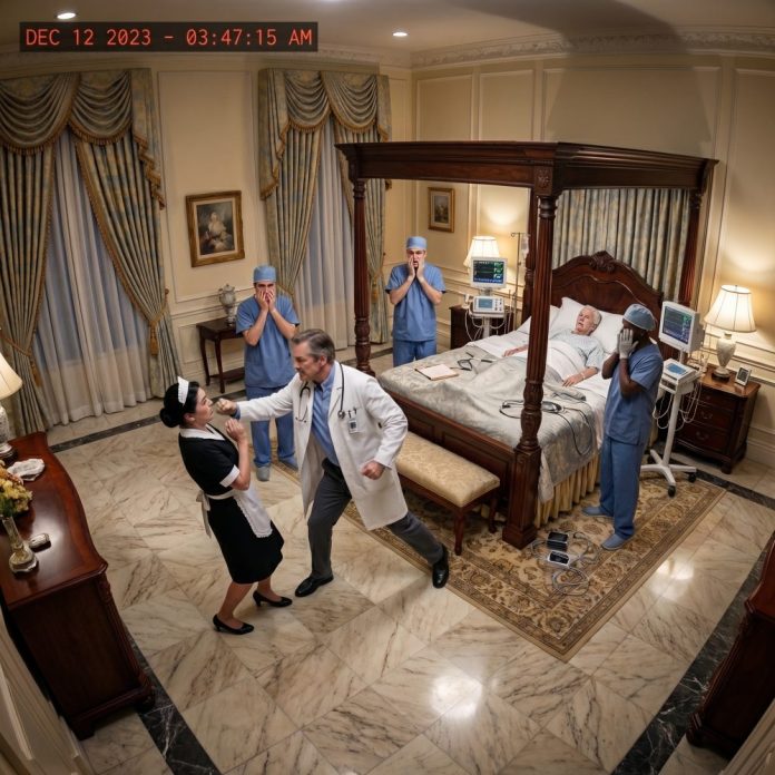 It started just after nine. I was folding fresh towels in the upstairs linen room when I heard shouting from the east wing. By the time I reached Mr. Ashford’s bedroom, the place was in chaos. Doctors from his private medical team crowded around the bed. One checked his pulse, another barked orders, and a third adjusted an oxygen mask over his face. Richard lay pale and motionless against dark silk sheets, his skin gray, his lips slightly blue. Someone said his blood pressure was crashing. Someone else yelled for another injection.