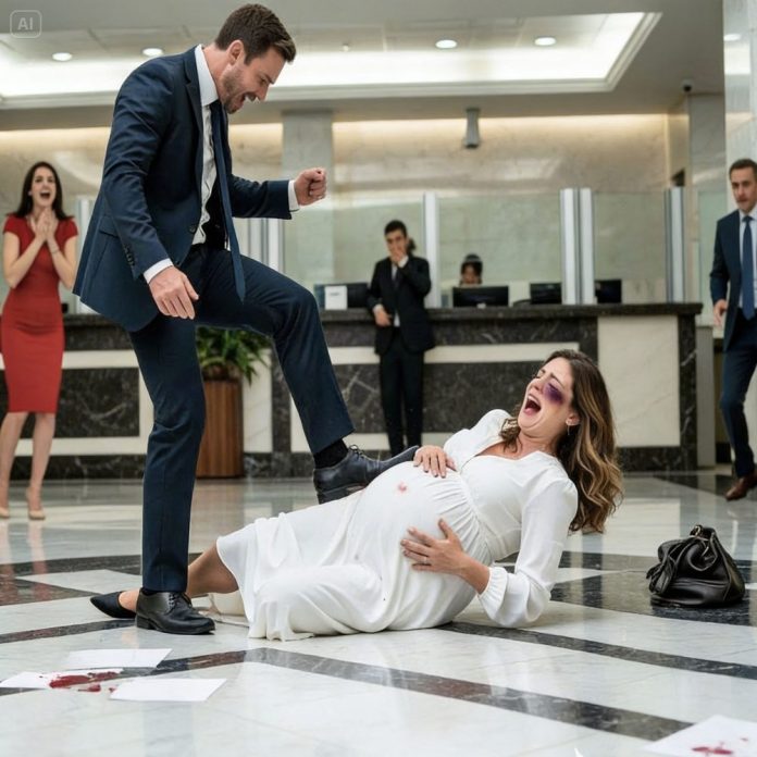I fell hard onto the polished floor of the bank lobby, one hand instinctively wrapping around my stomach before my shoulder hit the ground. The room exploded into motion. Someone screamed. A woman behind the desk rushed forward. My ears rang so loudly that for a second I heard nothing but my own breathing and one terrible thought: my baby.