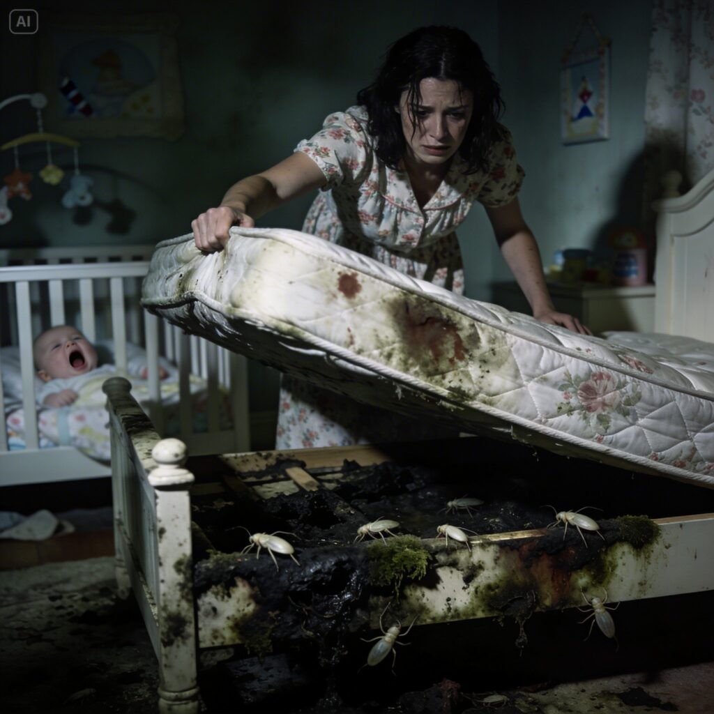 Her stomach tightened, but she forced herself to hold steady. A dark stain had spread beneath the outer lining, concealed by the mattress’s layered construction. Small ivory larvae writhed across the dampened surface, feeding.