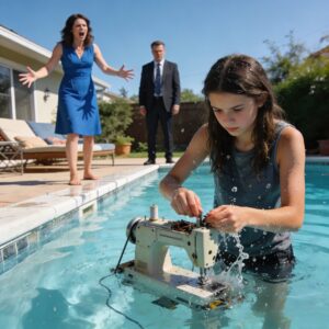 Lily fell to her knees beside the pool, desperately reaching for the sewing machine that had already sunk to the bottom. She had spent six months saving up—babysitting children, selling handmade bags online, cutting corners on everything. That machine was her dream. Her ticket to freedom.