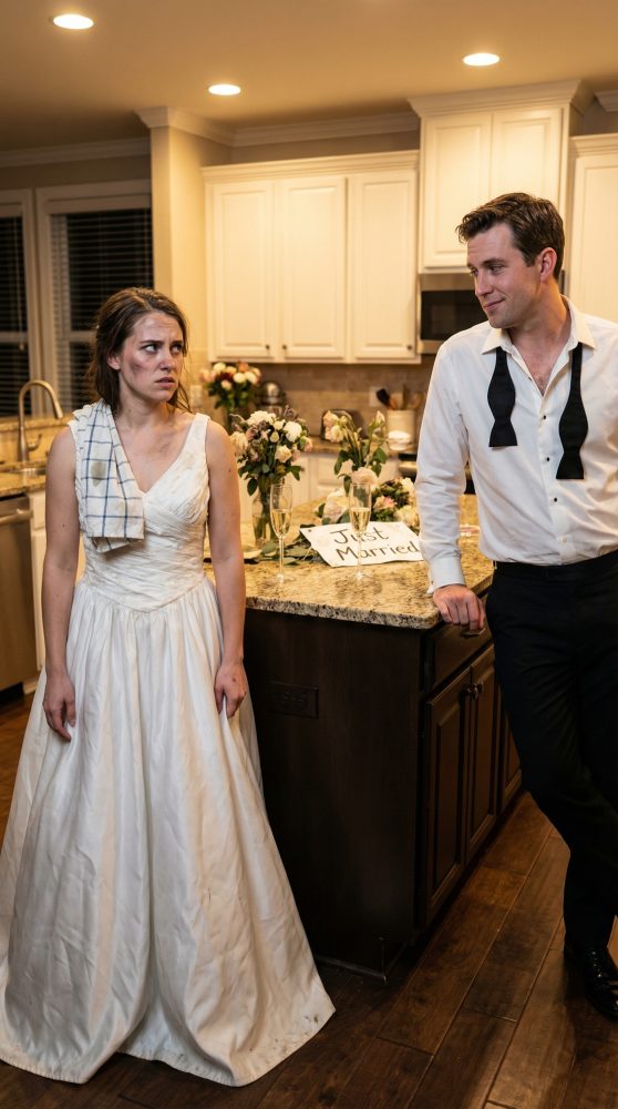 For one second, I just stood there in my white dress, the rag hanging from my shoulder, my bouquet still sitting in a vase by the sink. The house smelled like buttercream frosting, champagne, and roasted chicken from the reception leftovers his mother had packed for us. Everything looked warm and ordinary. Everything except him.