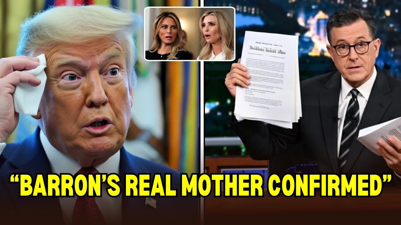 The document, which Colbert displayed briefly for the cameras, indicated that Melania Trump is not the biological mother of Barron Trump. Instead, it identified a different woman — a former model and acquaintance of the Trump family from the early 2000s — as the biological mother. The report listed Mr. Trump as the father and showed a 99.9999% probability match.