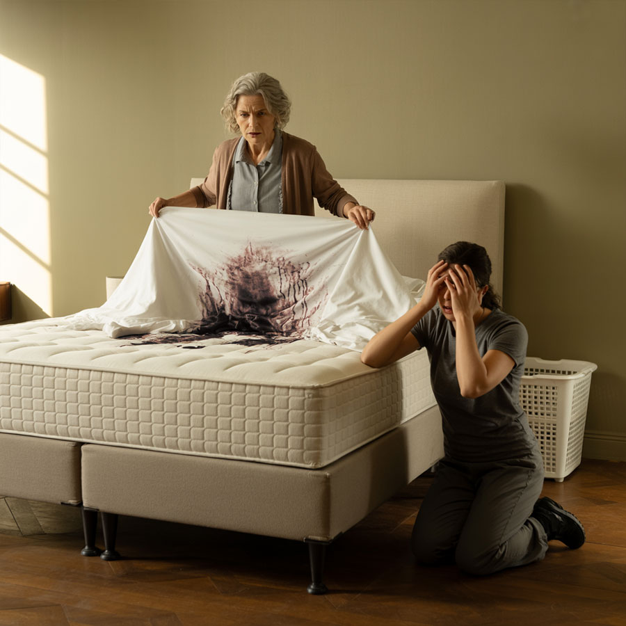 When I slipped inside the guest house, I froze. A thick, metallic smell filled the air. I stepped closer to the bed and pulled the sheet aside. What I saw made my stomach twist—dark stains, heavy and old, soaked deep into the mattress. Blood.