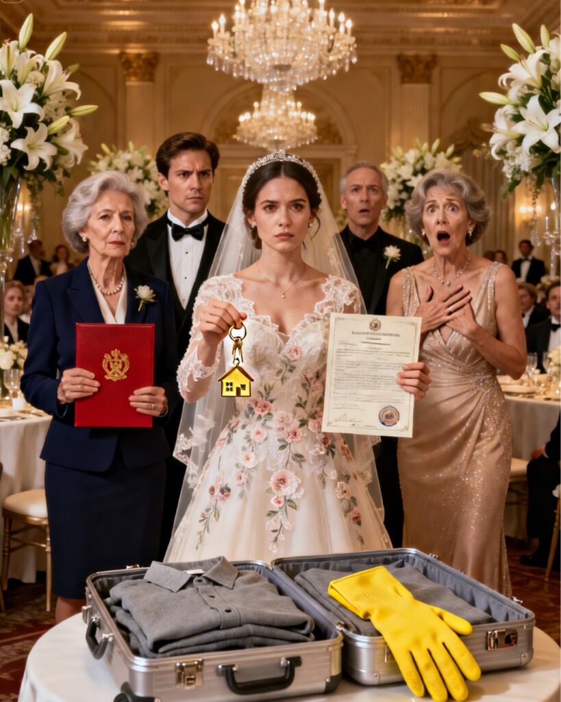 Inside was a gray maid’s uniform , perfectly pressed, stiff as an order. Underneath, a pair of shiny, almost insulting, yellow rubber gloves . No one laughed. No one applauded. The air froze.