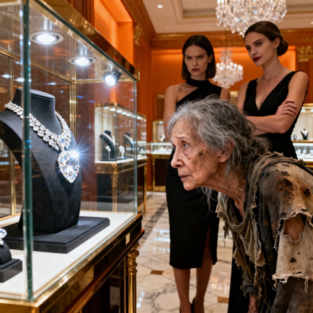 A disheveled old woman, her hair tangled and her clothes stained with dirt, timidly entered the shop. Her worn sandals dragged slightly as she walked, and in her hands she held a small cloth bag.