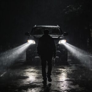 Two minutes later, headlights cut through the rain.