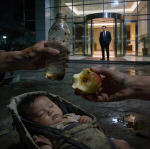 The evening wind moved slowly through the broken wooden shed, carrying with it the faint smell of dust and distant fried food from the glittering shopping mall nearby. Beneath that fragile shelter sat Mara, her back resting against a cracked beam, her body heavy with exhaustion. Her clothes were worn thin, her hair rough and untamed, her bare feet marked by the harshness of the streets.