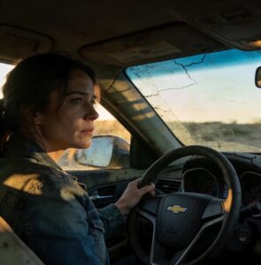 She exhaled slowly, guiding the car to the shoulder. The engine idled softly as she rolled down her window, placing both hands on the steering wheel in plain sight.